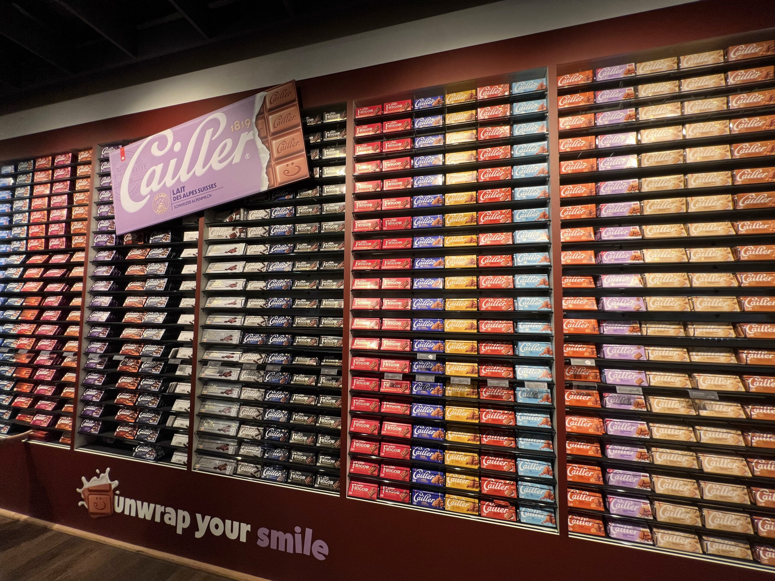 We start by seeing the Nestlé-Peter-Cailler transport wagons, the impressive manor house, the boutique, and the wall of colorful chocolate bars.